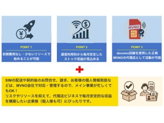 初期費用0可、ストック収益、docomo回線を使用した正規MVNOの通信サービスを扱えるという特長があるため、