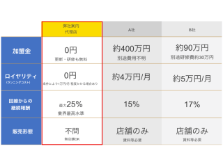 | 加盟店の収益モデル | 加盟金(初期費用)、ロイヤリティ、継続報酬、販売形態、いずれの点でも弊社商品に優位性・柔軟性がありますので、赤字の心配をせずに安心して販売いただけます。 |
