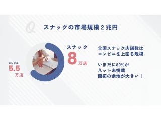 スナック業界は市場規模2兆円超、店舗数はコンビニよりも多い約8万店という巨大市場です。しかし、個人経営や高齢のオーナーが多く、約80%の店舗がネット上に詳しい情報を掲載していません。