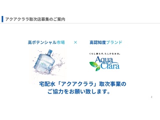 この成長市場で扱うのは、全国展開の宅配水ブランド「アクアクララ」。水の品質やブランド力がすでに高いので、ウォーターサーバーの導入ハードルが低いのも特徴です。