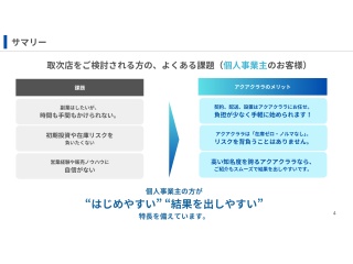さらに、取次店には販売ノルマがなく、固定費の重い営業体制を整える必要もありません。既存のネットワークや顧客基盤を活用して紹介できるので、営業経験のある個人事業主の副業や、法人の「+α提案商材」としても相性が良い設計になっています。