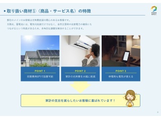 | 商材の強み | ・「光熱費削減」という実利があるため、節約ニーズに直接刺さる ・災害時の非常用電源として、安心・安全を求める層に響く ・初期費用0円、在庫なし、施工不要で圧倒的な低リスク |
